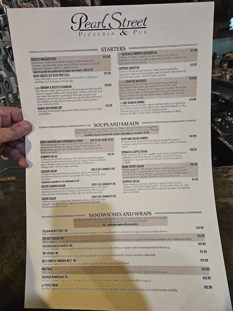The menu at Pearl Street Pizzeria & Pub is culinary diversity at its finest, catering to a variety of tastes. From the mouthwatering Mexican pizza, with its fluffy crust and fresh toppings, to their signature dish, the Spicy Chicken Gorgonzola Soup, each item is crafted with care and creativity. Patrons rave about the pizza’s perfect crunch and the rich, sweet, and tangy sauce that leaves a lingering flavor. The savory dry rub wings also receive high praise alongside the satisfying summer salad, proving there's something for everyone's palate.